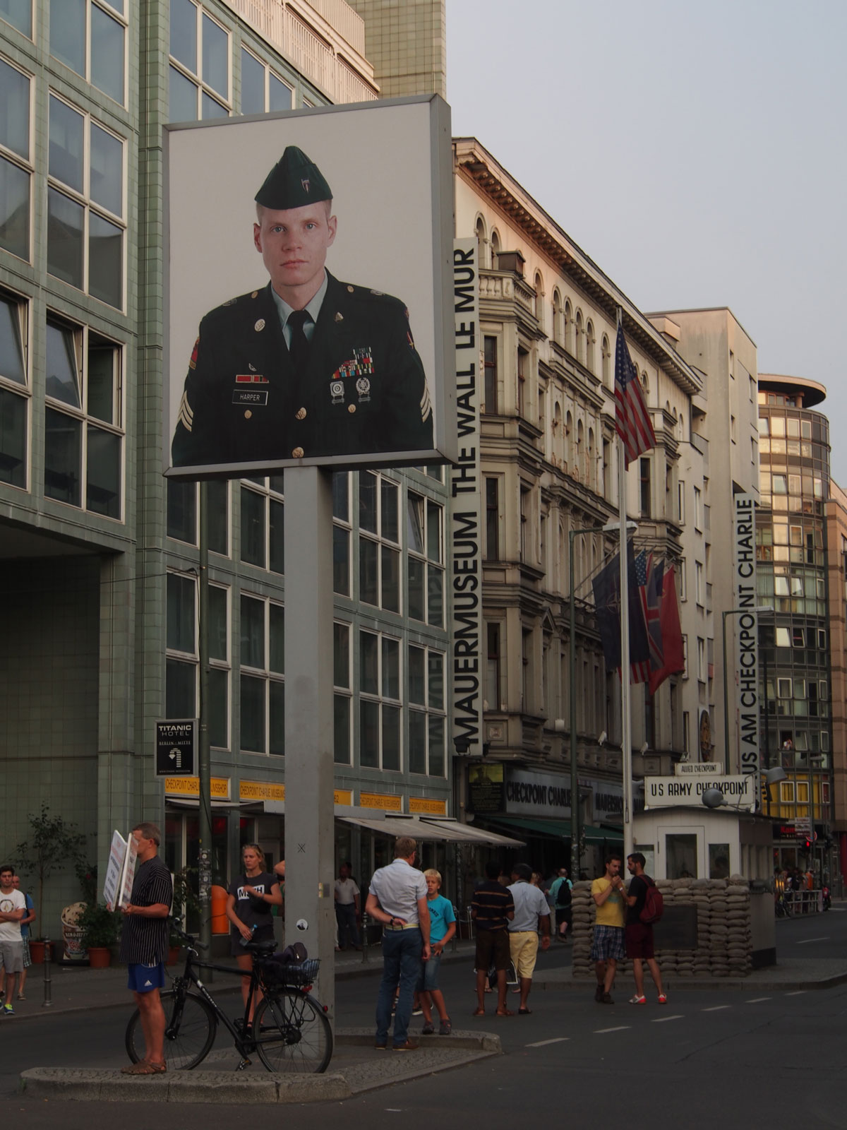 Charlie ismi NATO Alfabesinde C’nin simgesiymiş. Berlin’de Doğu- Batı geçiş noktaları arasında Helmstedt (Alpha) A, Dreilinden (Bravo) B noktalarından sonra üçüncü geçiş noktasıymış. II. Dünya Savaşından sonra 27 Ekim 1961’de oluşan gerginlik neticesi Sovyetler Birliği ve Amerikan asker ve tankları bu noktada karşılıklı olarak tek kurşun atmadan 16 saat boyunca beklemiş. Alimallah o kurşun atılsaymış bugün tarih kitaplarında III. Dünya Savaşını mı okurduk artık bilemem. Söz konusu gerginlikte karşı karşıya gelen panzerleri tasvir etmek için kapıya 1998 yılında Frank Thiel tarafından hazırlanmış Sovyet ve Amerikalı asker portreleri yerleştirilmiş.