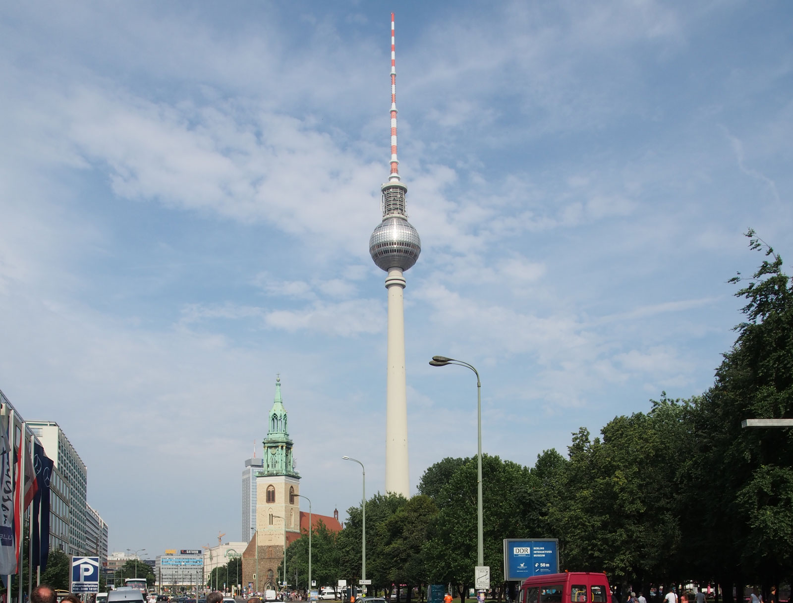 Parlamento Binasını ziyaret edeceğimiz zamanın gelmesini beklerken Berlin’in gezilecek yerlerinden buralarda olanlara bakalım diyoruz. Adayı geçince caddenin adı Karl-Liebknecht-Straße olmuş. Caddeye çıkınca ileride sağda 14. Yy’da Barok tarzda yapılmış Protestan Berlin Marien Kilisesi (Marienkirche) ve günümüzde Branderburg Kapısı gibi birleşmiş Almanya’nın sembolü olarak kabul edilen Berlin simgelerinden Berlin TV Kulesi gözüküyor.