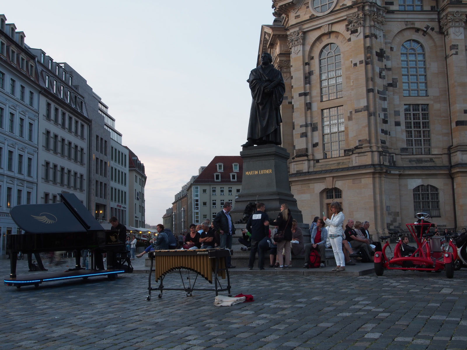 Güneş ışıklarının terk etmeye yüz tuttuğu pastel renkli meydan. Yaklaşan geceyi daha da romantik kılmak için bir piyanist görkemli Fauenkirche ve Martin Luther anıtını ardına almış. Piyanoda klasik müziğin büyülü nağmelerini bizlerle paylaşıyor. Genç çift dediklerimi doğrulamıyor mu sizce?